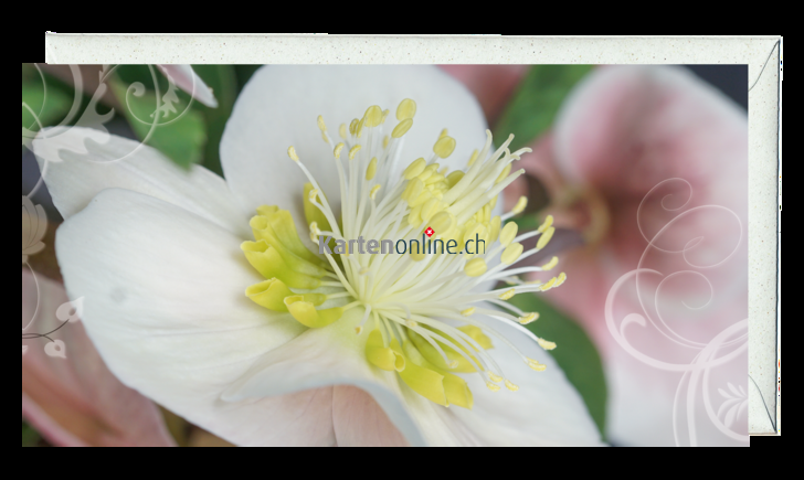 Grusskarte schmal - Closeup der Schneerose 'Snow Dance'