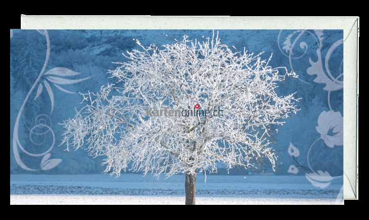 Grusskarte schmal - Mit Raureif verzauberter Obstbaum