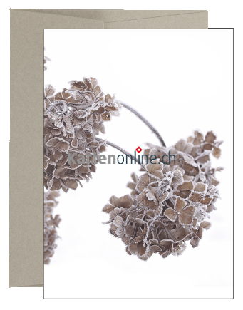 Stilvolle Beileidskarte mit dezenter Farbigkeit, gedruckt auf elegantes, leicht geripptes Naturpapier. Die Karte zeigt Blütenbälle der klassischen Gartenhortensie (Hydrangea macrophylla) mit dezentem Raureif nach einer frostigen Herbstnacht. Hortensien sind extrem dankbar, weil ihre Blüten monatelang schön anzusehen sind. Sogar wenn sie bereits alt und eigentlich verblüht sind, behalten sie ihren Reiz und stehen damit sinnbildlich für ein langes, harmonisches Leben und würdevolles Altern.