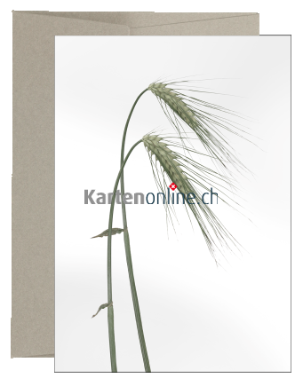 Stilvolle Beileidskarte mit dezenter Farbigkeit, gedruckt auf elegantes, leicht geripptes Naturpapier. Getreidehalme sind eines der häufigsten Motive auf Traueranzeigen überhaupt. Entgegen dem oft verwendeten Weizen (trägt nur kurze Grannen), dessen Ähre aufrecht, trotzig, ja etwas unbeugsam wirkt, haben wir uns bei dieser Karte für die Gerste entschieden. Sie trägt lange Grannen und symbolisiert unserer Ansicht nach die Endlichkeit des Lebens besser. Ihre nickenden Halme sind quasi vom Leben gezeichnet, aber nicht gebrochen, sondern strahlen würdevolle Eleganz und Anmut aus.