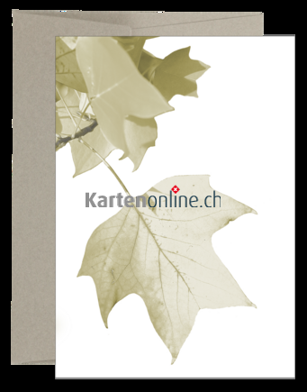 Stilvolle Beileidskarte mit dezenter Farbigkeit, gedruckt auf elegantes, leicht geripptes Naturpapier. Das Blatt des Tulpenbaumes (Liriodendron tulipifera) wird oft mit Ahorn verwechselt. Der Tulpenbaum ist ein hoher, wuchtiger Baum, der nicht selten bei Kirchen und Friedhöfen gepflanzt wird. Im Herbstgewand glänzt der Baum goldgelb in der Sonne, eine Offenbarung. Das elegante Blatt ist wie geschaffen für emotionale Trauerbekundungen.