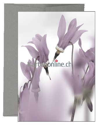 Stilvolle Beileidskarte mit dezenter Farbigkeit, gedruckt auf elegantes, leicht geripptes Naturpapier. Dank der nickenden kleinen Blüten, die etwas an Cyclamen erinnern, strahlt die Götterblume (Dodecatheon meadia) viel Charme aus. Mit ihrem himmlischen Namen, Götter- oder Sternschnuppenblume, stellt sie für Hinterbliebene überdies eine schöne Metapher für einen lieben Wunsch an den Verstorbenen dar.