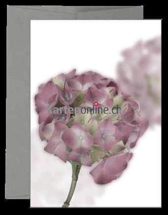 Stilvolle Beileidskarte mit dezenter Farbigkeit, gedruckt auf elegantes, leicht geripptes Naturpapier. Motiv dieser sehr beliebten Karte ist ein Blütenball der klassischen Gartenhortensie (Hydrangea macrophylla). Im Aufblühen zweifarbig und monatelang schön anzusehen, sogar wenn sie bereits alt und eigentlich verblüht ist, steht sie für ein langes, harmonisches Leben und würdevolles Altern.