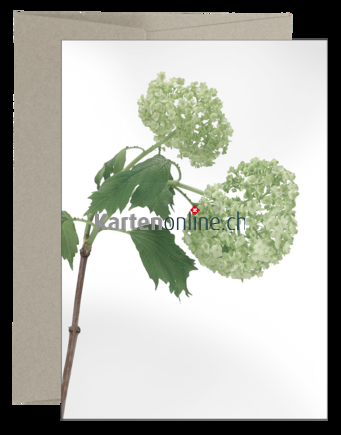 Stilvolle Beileidskarte mit dezenter Farbigkeit, gedruckt auf elegantes, leicht geripptes Naturpapier. Allein die Anmutung des frischen, leicht gebogenen Austriebs dieses Schneeballzweiges (Viburnum opulus), verbunden mit der reduzierten Farbigkeit, vermittelt Sinnlichkeit und Anmut. Das Bild ist der Beweis, dass die Art der Botschaft nicht nur vom gewählten Motiv, sondern von der Gesamtkomposition abhängt.