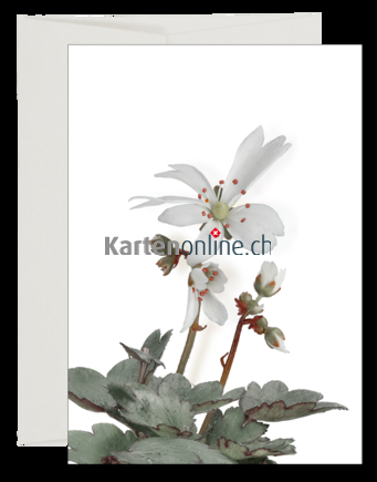 Stilvolle Beileidskarte mit dezenter Farbigkeit, gedruckt auf elegantes, leicht geripptes Naturpapier. Das Motiv zeigt einen kleinblütigen, herbstblühenden Steinbrech (Saxifraga cortusifolia 'Dancing Pixie'). Das filigrane Pflänzchen mit den verspielten Blüten und dem dunklen Blattwerk ist ein veritables Kleinod im Herbstgarten. Es strotzt noch vor Blühkraft, wenn die meisten anderen Blütenpflanzen längst verblüht sind. Der Steinbrech steht für Robustheit und Beständigkeit und symbolisiert ein langes, bewegtes Leben, das trotz widriger Umstände erfüllend und war und friedvoll zu Ende ging.