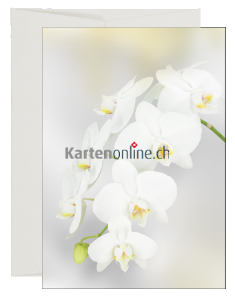 Stilvolle Ereigniskarte mit dezenter Eleganz. Gedruckt auf leicht geripptes Naturpapier. Schmetterlings-Orchideen sind die mit Abstand bekanntesten und beliebtesten Orchideen. Das liegt vor allem an der Eleganz, Blühfreudigkeit und Langlebigkeit der Blüten, aber auch an der unübertroffenen Symbolik, welche die opulenten Rispen vermitteln. Weisse Orchideen stehen vor allem für Reinheit und Eleganz. Für uns das perfekte Motiv für aufrichtige Genesungswünsche.