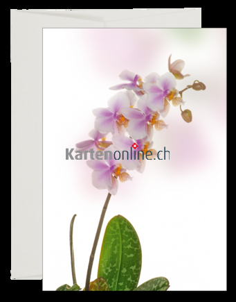 Stilvolle Ereigniskarte mit dezenter Eleganz. Gedruckt auf leicht geripptes Naturpapier. Schmetterlingsorchideen blühen oft monatelang. Das Bild zeigt eine liebliche Hybride von Phalaenopsis wiganiae. Der perfekte Willkommensgruss!