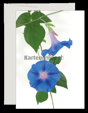 Stilvolle Ereigniskarte mit dezenter Eleganz. Gedruckt auf leicht geripptes Naturpapier. Die Prunkwinde gehört zu den eindrücklichsten einjährigen Kletterpflanzen. Ihre blauen Trompetenblüten sind eine Wucht. Ein schöner Glanzpunkt für einen würdigen Abschied.