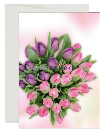 Stilvolle Ereigniskarte mit dezenter Eleganz. Gedruckt auf leicht geripptes Naturpapier. Die Karte zeigt einen rosa-violetten Tulpenstrauss als Symbol für den Neuanfang im Frühling. Neuanfang in ein neues Lebensjahr ist ebenfalls das Thema bei jedem Geburtstag den man feiern darf.